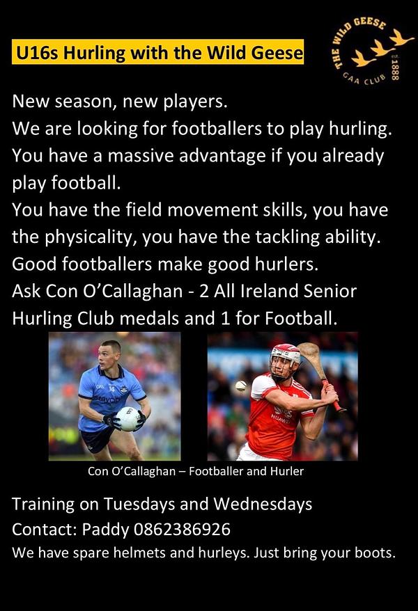 Wild Geese U16s are looking for new players for the season ahead. No hurling experience needed – we’ve spare helmets & hurleys, just bring your boots!